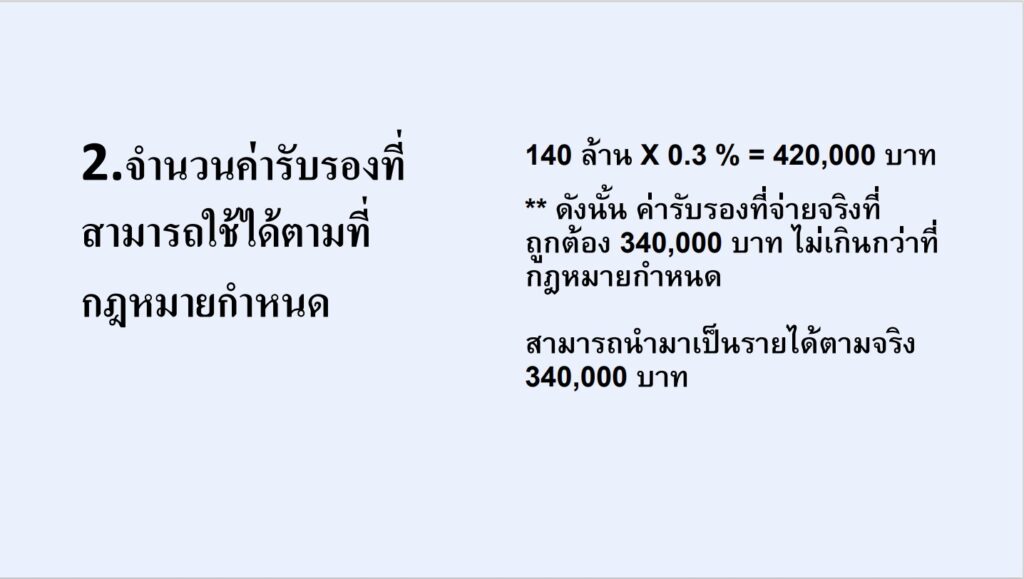 6.จำนวนเงินค่ารับรองและค่าบริการที่นำมาเป็นรายจ่ายได้ สามารถ หักได้ตามจริง แต่ไม่เกิน ร้อยละ 0.3 ของรายได้หรือยอดขาย และทุนจดทะเบียนที่ชำระแล้ว แล้วแต่อย่างใดจะสูงกว่า ทั้งนี้ต้องไม่เกิน 10 ล้านบาท
