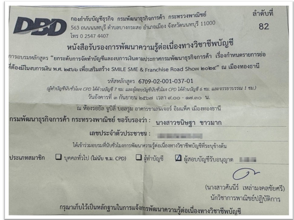เมเมื่อวันที่   คุณขนิษฐา (กรรมการบริษัทฯ) ได้เข้าอบรมหลักสูตร " ยกระดับการจัดทำบัญฯชีและงบการเงินตามประกาศกรมพัฒนาธุรกิจกรค้า เรื่องกำหนดรายการย่อที่ต้องมีในงบการเงิน พ.ศ. เพื่อเสริมสร้าง SMILE SME & Franchise Road Show 2024" ณ เมือ่ง