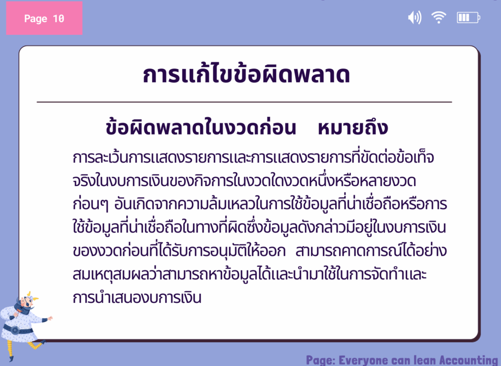 กิจการต้องแก้ไขข้อผิดพลาดที่มีสาระสำคัญของ งวดก่อนโดยปรับย้อนหลังในงบการเงินฉบับแรกที่ได้รับการอนุมัติให้เผยแพร่หลังจาก ที่พบข้อผิดพลาดโดย