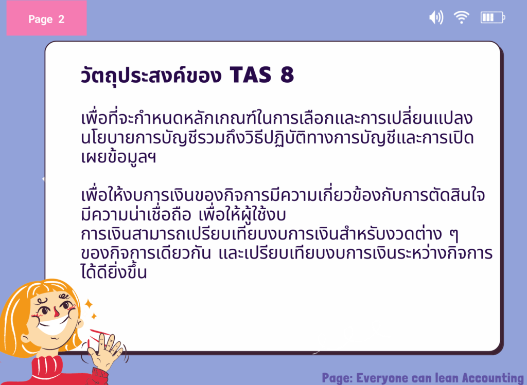 มาตรฐานการบัญชีนี้ มีวัตถุประสงค์ ที่จะกำหนดหลักเกณฑ์ในการเลือกและการเปลี่ยนแปลง นโยบายการบัญชีรวมถึงวิธีปฏิบัติทางการบัญชีและการเปิดเผยข้อมูลฯ เพื่อให้งบการเงินของกิจการมีความเกี่ยวข้องกับการตัดสินใจ มีความน่าเชื่อ ถือ เพื่อให้ผู้ใช้งบการเงินสามารถเปรียบเทียบงบการเงินสำหรับงวดต่าง ๆ ของกิจการเดียวกัน และเปรียบเทียบงบการเงินระหว่างกิจการได้ดียิ่งขึ้น