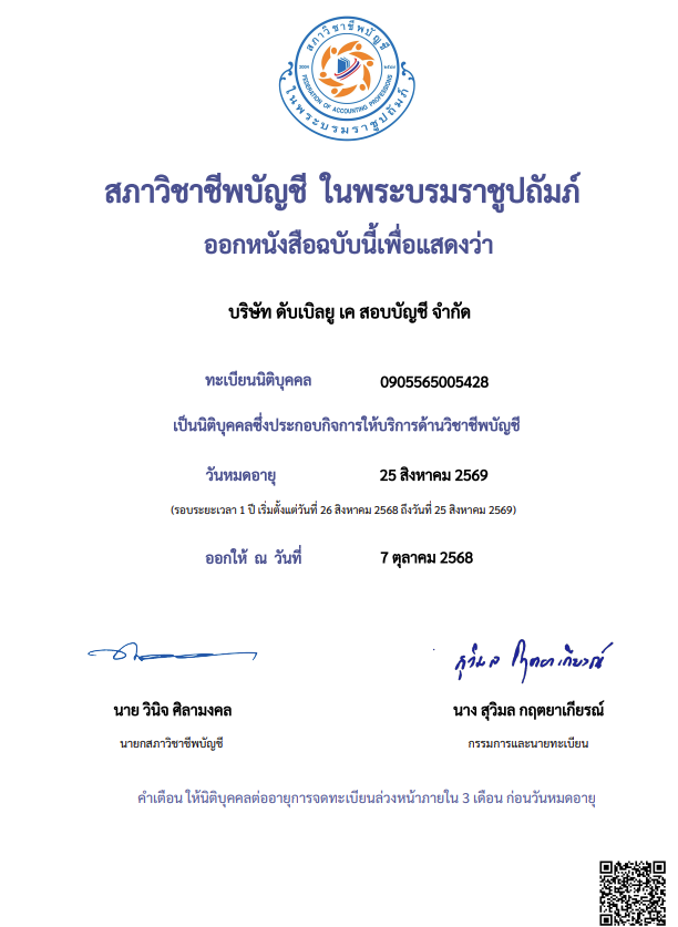 สภาวิชาชีพบัญชีฯ ได้ออกหนังสือรับรองให้ บริษัท ดับเบิลยู เค สอบบัญชี จำกัด เป็นนิติบุคคลซึ่งประกอบกิจการให้บริการด้านวิชาชีพบัญชี เมื่อวันที่ 9 พ.ย. 65